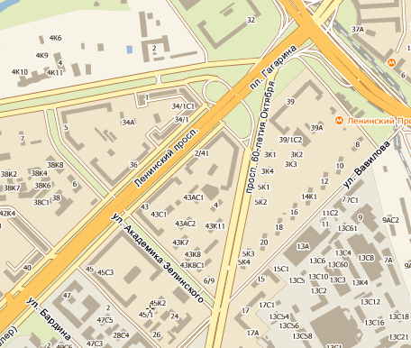 Город Москва детализирован до контуров зданий и адресов с примерным соответствием масштабу 1:10 000 и представлен полностью в пределах административных границах города.